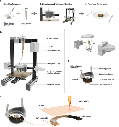 Khác với các máy in 3D thực phẩm truyền thống – vốn tạo hình bằng cách đùn bột thực phẩm lạnh rồi phải đưa sang lò nướng hoặc thiết bị gia nhiệt riêng để làm chín – thiết bị mới kết hợp toàn bộ quá trình trong một hệ thống duy nhất. Máy sử dụng bộ gia nhiệt hồng ngoại siêu mỏng làm từ graphene laser (LIG), giúp kiểm soát nhiệt độ chính xác đến từng lớp in.
